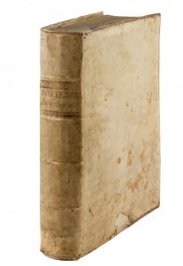 In-4° (mm 240x180). Pagine [24], 303, 1 bianca, [12], 296, [56] + 12 carte di tavole calcografiche fuori testo e più volte ripiegate, numerate I-XII. Margine inferiore del frontespizio restaurato, piccolo lavoro di tarlo nel bordo interno delle prime 50 carte circa, altro lavoro di tarlo nel margine interno dei quaderni P-S della seconda parte, con perdita di alcune lettere di testo, altrimenti bella copia marginosa e fresca. Legatura coeva in piena pergamena con titoli manoscritti al dorso. Lacune e mancanze alle estremità dei piatti colmate con inserti di pergamena antica. Ex-libris al foglio di guardia anteriore, nota di possesso manoscritta al frontespizio Joannes de Brignoli, molte postille al testo della stessa antica mano. Prima e unica edizione. Cfr. Pritzel 7265.