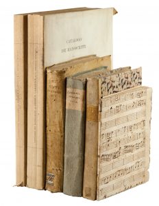 In-4° (mm 214x160). Pagine [8], 230, [2] + 1 ritratto in antiporta e 12 carte di tavole incise in rame fuori testo. Testatine e capilettera xilografici. Leggere gore d'acqua negli angoli interni delle prime 50 carte, lavoro di tarlo nel margine interno dei fascicoli C-D, che lede l'inciso di una tavola, ma nel complesso discreto esemplare. Legatura coeva in piena pergamena rigida con titoli manoscritti al dorso. Nota di possesso manoscritta al foglio di guardia anteriore. SI AGGIUNGE: Sigonio Carlo, De episcopis bononiensibus libri quinque. Bononiae: Per Alexandrum Benatium, 1586. In-4° (mm 210x140). Pagine 4 bianche, [4], 259, 5 bianche, [64], 1 bianca. Frontespizio xilografico con allegoria della città di Bologna, testo riquadrato da cornice tipografica. Gora d'acqua alle prime carte bianche, rinforzi marginali al frontespizio e alla dedica e legatura un po' allentata internamente. Legatura settecentesca in mezza pergamena con piatti marmorizzati e titoli entro tassello al dorso. SI AGGIUNGE: Martello Pier Jacopo, Il secretario Cliternate al Baron di Corvara di satire libro. In Cosmopoli [ma Bologna]: al Grifo, 1717. In-4° (mm 185x138). Pagine 47, 1 bianca + 1 carta di tavola incisa in rame fuori testo. Rinforzi alla tavola e l'ultima carta conservata sciolta all'interno, alcune carte con brachette di rinforzo. Legatura in cartonato ricoperto da un foglio musicale. SI AGGIUNGE: Zanotti Francesco Maria, Dell'Arte poetica ragionamenti cinque... In Bologna: Nella Stamperia di Lelio dalla Volpe, 1768. In-8° (mm 205x135). Pagine XII, 401, [1]. Lievi e sporadiche arrossature sparse. Cartonato coevo con titoli manoscritti su etichetta al dorso; piccolissime mancanze ai piatti ma buon esemplare in barbe. SI AGGIUNGE: Catalogo dei manoscritti di Giosuè Carducci. a cura di Albano Sorbelli. Bologna: A spese del Comune, 1921, 2 voll. 4 opere in prima edizione. I OPERA: Prima edizione di questo panegirico di Luigi XIV pubblicato  in occasione del battesimo del primogenito dell'Autore, Marchese Filippo Sampieri. I componimenti sono opera di Giovanni Giuseppe Orsi, Eustachio Manfredi, Cornelio Pepoli, Gregorio Casali, Francesco Pepoli, Pier Jacopo Martelli e altri. Il corredo iconografico dell'opera si compone di un ritratto del Dedicatario Luigi XIV inciso in rame all'antiporta da Francesco Maria Francia e da 12 tavole, in apertura di ciascun canto, incise in rame da Ludovico Mattioli. II OPERA: Prima edizione. III OPERA: Prima edizione, molto rara. Cfr. Melzi III, 44; Parenti 64. IV OPERA: Prima edizione. Cfr. Canterzani 246: «Edizione originale non comune».