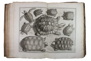 2 volumi (su 4) in-folio massimo (mm 540x380). Pagine [36], 178; [34], 154. Con nel complesso 225 tavole numerate incise fuori testo, molte a doppia pagina  (111 nel primo volume e 114 nel secondo), 1 bella antiporta con allegoria dell'Industria e 1 ritratto dell'Autore al primo volume, il tutto calcografico. Frontespizi stampati in inchiostro rosso e nero ornati da una bella vignetta calcografica, testatine incise in rame, moltissime iniziali illustrate, finalini e fregi tipografici. Testo in latino e in italiano. Alcune lievi bruniture sparse nelle carte di testo, più frequenti nel secondo volume, e alcuni lievi strappetti ma splendida copia in barbe e con le tavole in nitida tiratura. Legatura coeva in mezza pelle rossa con piatti marmorizzati con titoli su tasselli cartacei applicati ai dorsi e parzialmente caduti. Dorsi e piatti lisi. Seconda edizione, stampata nello stesso anno della prima, di questo splendido catalogo di piante e animali esotici appartenenti alla Wunderkammer dell'Autore, che aveva collezionato questi esemplari durante i suoi viaggi come membro della Compagnia delle Indie. L'opera è particolarmente apprezzata per le bellissime illustrazioni, 225 splendide incisioni anche a doppia pagina raffiguranti rettili, mammiferi, uccelli, piante e anfibi tutte realizzate sotto la supervisione di Seba, in prevalenza da Pieter Tanjé ma anche da A. van der Laan, F. de Bakker, F. Morellon de la Cave, J. Folkema, J. Punt, W. Jongman e altri. Tanjé ha inciso anche l'antiporta con allegoria dell'Industria e le vignette poste come testatine, mentre Il ritratto dell'Autore è stato inciso da Jacobus Houbraken su disegno di Jan Maurits Quinkhard. Cfr. Holthuis 242-243: «The quality of the far larger part of the plates is superb and a surprising percentage of the species is recognizable [...], the plates make Seba's work one of the more important of its time, also for purposes of zoological nomenclature, as Linnaeus and many subsequent authors based new species upon figures from Seba's work»; Nissen ZBI, 3793; Nissen BBI, 1825. Il nostro esemplare si compone dei soli primi due volumi, mentre mancano il terzo e quarto editi postumi, rispettivamente nel 1758 e nel 1765, e da differenti stampatori.