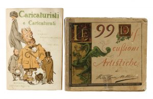 In-16° (mm 188x125). Pagine 146, [1], 1 bianca con 54 incisioni in bianco e nero e 8 cromolitografie interne alle pagine. Buona copia, internamente in ottimo stato di conservazione. Conservata la brossura originale in cartonato con illustrazioni e titoli impressi a colori. Al contropiatto anteriore ex-libris Marsili Libelli. SI AGGIUNGE: Molteni Gasi Enrico (pseud. di Telemaco Signorini), Le 99 discussioni artistiche […]. Firenze: Landi, 1866. In-16° oblungo (mm 168x85). Carte [6], XCI, [3]. Frontespizio in rosso e nero, un ritratto litografico dell'Autore in principio di volume e 100 bei capilettera alle pagine. Per un difetto di legatura ab origine circa 20 pagine con numerazione romana si trovano fuori ordine, ma il testo è ben completo e nelle sue barbe, seppur interessato da alcune tracce d'uso e bruniture uniformi. Un restauro alla carta d'occhietto ed un piccolo foro di tarlo alle prime carte. Legatura in cartonato editoriale con titolo e autore riportati al piatto anteriore e al dorso con impressione a colori. Diverse mancanze laterali, rinforzi in nastro adesivo trasparente alle cerniere e angoli lenti. I opera: Edizione originale con illustrazioni e caricature realizzate da A. Tricca e altri artisti macchiaioli toscani frequentatori del Caffè Michelangiolo.