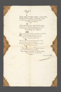 BARBEY D'AUREVILLY (Jules). Saigne! Poème autographe signé, 1 page in-folio (337 x 224 mm) à l'encre brune, taches (de sang?) faites volontairement aux angles, sous chemise demi-maroquin noir moderne.