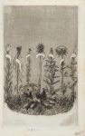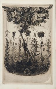 • la très rare eau-forte refusée pour le frontispice, représentant les sept péchés capitaux symbolisés par sept plantes, avec le squelette en position de crucifié.