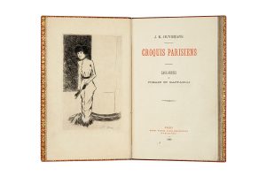 HUYSMANS (Joris-Karl). Croquis parisiens. Eaux-fortes de Forain et Raffaelli. Paris, Henri Vaton, 1880. In-8, maroquin orange, encadrement d'un jeu de six filets dorés, dos orné, dentelle intérieure, tranches dorées sur marbrure, non rogné,...