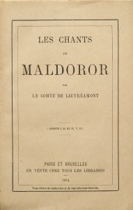 LAUTRÉAMONT (Isidore Ducasse, comte de). Les Chants de Maldoror. Paris et Bruxelles, En vente chez tous les libraires, 1874. In-12, broché, chemise demi-maroquin noir avec coins et à recouvrement, dos orné, étui (Devauchelle).