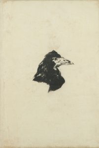 Deux vignettes montrent le corbeau: celle pour l'ex-libris le représente les ailes déployées; l'autre, sur la couverture, est une impressionnante tête de l'oiseau, vu de profil. Utilisée pour illustrer l'affiche de librairie, cette gravure est assurément la plus emblématique de l'ouvrage et reste figée dans les esprits.