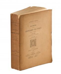 In-8° (mm 240x165). Pagine [LXXIV], 670, [1], 1 bianca. Con 1 ritratto di Leonardo da Vinci in litografia e 2 acqueforti con vedute di Vinci e Anchiano di Telemaco Signorini. Tutte le illustrazioni sono corredate di velina protettiva. Lieve foxing alle tavole, uno strappo marginale a pagina 57 e fascicoli leggermente bruniti, ma buon esemplare, ben conservato e in barbe. Brossura editoriale con riproposizione del frontespizio al piatto anteriore e indicazione di autore e titolo alla costola. Minime mancanze. -