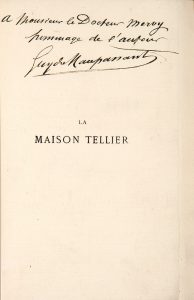 Envoi autographe de Maupassant à Monsieur le docteur Mervy, sans doute un des nombreux médecins auxquels eut si souvent affaire l'écrivain.