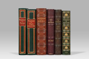 MAUPASSANT (Guy de). Contes choisis. Paris, Société des bibliophiles contemporains, 1891-1892. 10 volumes grand in-8, maroquin de diverses couleurs (bleu, orange, rouge, vert, havane, etc.), janséniste, fleur dorée et mosaïquée aux angles,...