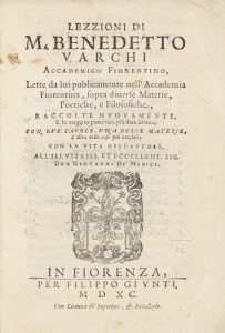 Varchi Benedetto, Lezzioni [...] Lette da lui pubblicamente nell'Accademia Fiorentina, sopra diverse Materie, Poetiche, e Filosofiche... In Fiorenza: per Filippo Giunti, 1590.