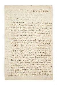 À peine rentré de son long voyage en Orient (décembre 1842-décembre 1843), Nerval écrit à son père, de Nîmes. Il regrette de ne pouvoir être à Paris pour sa fête [saint-Étienne, 26 décembre], mais annonce son retour à Paris pour le nouvel an: À l'âge que j'ai, on ne se sépare pas de son seul parent sans quelque peine et c'est aussi un grand plaisir de savoir qu'on va le retrouver et pour longtemps. Il évoque son futur Voyage en Orient: J'ai placé avantageusement mon voyage d'Égypte qui fera un volume avec gravures [projet qui n'aboutira pas] [...] j'ai d'un côté le Caire de l'autre Constantinople bien étudiés tous les deux l'un durant cinq mois, l'autre durant quatre. Il préférerait cependant une édition en volume plutôt que l'insertion dans un journal car Les journaux donnent de l'argent pour le moment mais quand tout est fini, l'on se trouve au dépourvu, fatigué seulement et malade quelquefois.