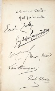 Exemplaire portant un envoi collectif à un certain Monsieur Coulon, rédigé et signé par Henry Céard et accompagné de la signature autographe des cinq co-auteurs.