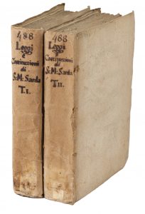 In-folio (380x245). Pagine [8], 644, [14], di cui l’ultima bianca. Frontespizio stampato a due colori con stemma sabaudo inciso in rame. Testo in italiano e francese a due colonne. Staccata ma conservata la carta di Errata, rare fioriture ma buon esemplare. Legatura in piena pergamena coeva con dorso a 5 nervi e titolo manoscritto ad uno dei comparti. Alcuni fori di tarlo al dorso. SI AGGIUNGE: Id., Leggi e costituzioni di Sua Maestà. Tomo primo (-secondo). In Torino: nella stamperia reale, 1770. 2 volumi in-4° (mm 280x210). Pagine XII, 504; 574, [2]. Frontespizi con stemmi calcografici dei Savoia. Testo in italiano e francese a due colonne. Ottimo esemplare, nelle sue barbe e ben conservato. Legatura in cartonato coevo con titoli manoscritti al dorso. I opera: prima edizione.