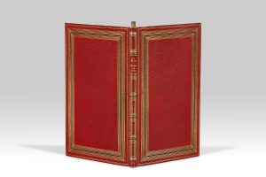dos orné de même dans les compartiments, filet intérieur, doublure de maroquin bleu serti d'un filet doré, gardes de soie rouge, tranches dorées, non rogné, couverture et dos, chemise demi-maroquin rouge à recouvrement, étui (Huser).