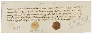 1347. MANUSCRITO: (BARCELONA-SANTA MARIA DEL MAR). RECIBO DE 80 SUELDOS? POR LOS TRABAJOS REALIZADOS POR UN COFRADE EN LA CONSTRUCCIÓN DE SANTA MARIA DE LA MAR. 7,5 X 21 cm. 4 líneas de texto en catalán. Dado el 6 de octubre...