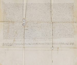 1404. MANUSCRITO: (BARCELONA). VENTA DE UNAS CASAS CON HUERTO CONTIGUO EN BARCELONA A ANTONI TRIES ARGENTER, PRECIO DE 560 SUELDOS?. Manuscrito sobre pergamino 50,5 x 58,5 cm. Con fecha 18 de mayo de 1404. Con dos faltas que...