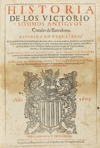 1603. LIBRO: (BARCELONA). DIAGO, FRANCISCO: HISTORIA DE LOS VICTORIOSISSIMOS ANTIGUOS CONDES DE BARCELONA. DIVIDIDA EN TRES LIBROS... Barcelona: Sebastián de Cormellas, 1603. Folio. 8 hojas, 318 folios, 10 hojas. Leve...