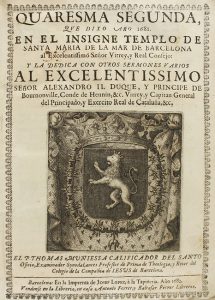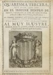 Imp. Josef Lopez, 1682. 8º mayor. 12 h. + 284 p. + 94 p. + 26 h. Escudo grabado en la portada, en orla. Viñetas en el texto. Enc. en pergamino. Palau 184717. [Más:] ID.: QUARESMA TERCERA, QUE DIXO AÑO 1682. EN EL INSIGNE TEMPLO... Id., 1683. 11 h. + 441 p. + 23 h. Escudo grabado en portada. Pergamino. No en Palau. *B07-13, B07-14