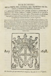 DEPUTACIÓ Y GENERAL DE CATALUNYA, Y ALTRES. VAN ANYADITS EN ESTA ULTIMA IMPRESSIÓ LAS CIUTATS, VILAS, Y LLOCHS DEL PRESENT PRINCIPAT, Y COMPTATS DE ROSSELLÓ Y CERDANYA DISTRIBUITS PER SAS VEGUERIAS. Barcelona: en casa de Rafel Figueró, 1698. 8º. 320 p. Escudo de la Diputación del General grabado en madera en la portada. Encuadernación de la época en pergamino. Después de la portada empieza el texto y está paginado 5, signatura A3, pero no falta ninguna hoja porque la primera es blanca y forma pliego (suele faltar a muchos ejemplares). Aguiló 1434. Palau 74121. Edición original en base a la publicada en 1672, con el añadido nuevo que empieza en la página 241, ´Nomina de las Ciutats, Vilas, y llochs del Principat de Cathalunya, y Comptats de Rosselló, y Serdanya, dividits per las Veguerias´. *B07-38.