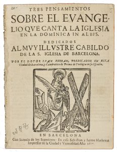 1627. FOLLETO: (BARCELONA-VIDA DE IGLESIA). FERRAN, IUAN: TRES PENSAMIENTOS SOBRE EL EVANGELIO QUE CANTA LA IGLESIA EN LA DOMINICA IN ALBIS. Barcelona: Sebastian y Iayme Mathevat, 1627. 8º. 8 h. Grabado xilográfico en la...