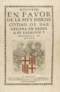 1634. FOLLETO: (BARCELONA). IOFFREU, ANTONIO: DISCURSO EN FAVOR DE LA MUY INSIGNE CIUDAD DE BARCELONA EN ORDEN A SU EXENCION Y FRANQUESA DE QUINTO. Barcelona: Iayme Matevad, 1634. Folio. 31 hojas. Texto con aspotillas...