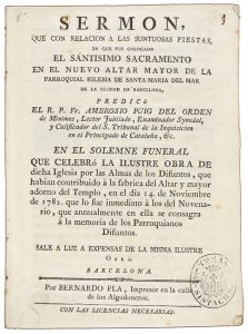 MARIA DEL MAR. Barcelona: Comellas, 1689. Folio menor. 77 p. Portada con orla tipográfica. [Más:] LOS PETRUS ROIG & MORELL SACRISTA MAJOR... PARROCHIAE PRAEDICTAES. MARIE DE MARI... Barcelona: 1693. 6 h. [Más:] ID. 16 h. [Más:] REFLEXIONES SOBRE LOS MOTIVOS Y CIRCUNSTANCIAS QUE YA EXPUSO, Y EXPONE DE NUEVO EL PRESBYTERO DON JUAN BORRAS, EN FAVOR... DE SANTA MARIA DEL MAR... Madrid: Antonio Perez de Soto, 1767. 4º mayor. 4 h. [Más:] ABADIA Y LOBERA: CHRYSOSTOMO: SERMON QUE EN LA SOLEMNE TRANSLACION DEL Smo SACRAMENTO A SU NUEVO ALTAR MAIOR DE LA IGLESIA PARROQUIAL DE Sta MARIA DEL MAR. Barcelona: Imp. Bernardo Pla, 1782. 8º mayor. 34 p. [Más:] PUIG DEL ORDEN, AMBROSIO: SERMON QUE CON RELACION A LAS SUNTUOSAS FIESTAS... NUEVO ALTAR MAYOR DE LA PARROQUIAL IGLESIA DE SANTA MARIA DEL MAR. Barcelona: Bernardo Pla, 1782. 30 p.