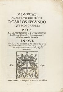 1690. FOLLETO: (CATALUÑA). MEMORIAL AL REY NUESTRO SEÑOR D. CARLOS SEGUNDO (QUE DIOS GUARDE) POR EL ILUSTRISSIMO, Y FIDELISSIMO CONSISTORIO DE DEPUTADOS, Y OYDORES DE CUENTAS DEL PRINCIPADO DE CATALUÑA EN QUE SUPLICA A SU MAGESTAD...