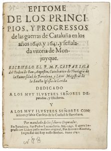 1641. LIBRO: (MONTJUICH-GUERRA DELS SEGADORS). SALA, GASPAR: EPITOME DE LOS PRINCIPIOS, Y PROGRESSO DE LAS GUERRAS DE CATALUÑA EN LOS AÑOS 1640 Y 1641 Y SEÑALADA VITORIA DE MONJUYQYE. Barcelona: Imp. Pedro Lacavalleria,...