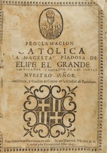 1641. LIBRO: (BARCELONA-GUERRA SEGADORS). PROCLAMACION CATOLICA [L]A MAGESTAD PIADOSA DE [F]ELIPE EL GRANDE... [LOS] CONSELLERES, Y CONSEJO DE CIENTO DE LA CIUDAD DE BARCELONA. Barcelona: Iayme Matevad, 1641. 8º. 134 p. (con...