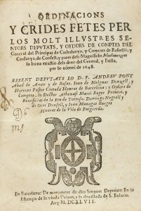 1647. LIBRO: (BARCELONA). ORDINACIONS, Y CRIDES, FETES PER LOS MOLT ILLUSTRES SENYORS DEPUTATS, Y OYDORS DE COMPTES DEL GENERAL DEL PRINCIPAT DE CATHALUNYA... Barcelona: Estampa de la viuda Deuixen, 1647. 8º. 24 h., 203 p. Enc....
