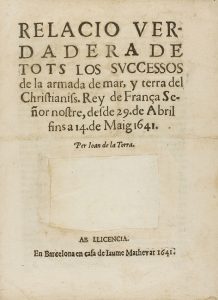 1641. Barcelona: en casa de Iaume Mathevat, 1641. 8º mayor. 3 h. Sin cubiertas. Palau 335046. Escudo recortado de la portada.