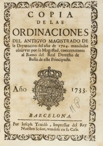 1733. LIBRO: (BARCELONA-DERECHO). COPIA DE LAS ORDINACIONES DEL ANTIGUO MAGISTRADO DE LA DEPUTACION DEL AÑO DE 1704, MANDADAS OBSERVAR POR SU MAGESTAD, CONCERNIENTES AL RAMO DEL REAL DERECHO DE BOLLA DE ESTE PRINCIPADO....
