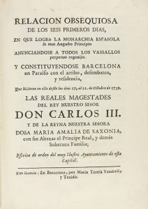 CONSTITUYENDOSE BARCELONA UN PARAISO CON EL ARRIBO , DESEMBARCO, Y RESIDENCIA. que hicieron en ella desde los dias 17, al 21 de Octubre de 1759 las REALES MAGESTADES DEL REY NUESTRO SEÑOR CARLOS III y de la reyna nuestra señora DOÑA MARIA AMALIA DE SAXONIA.. Barcelona: Maria Teresa Vendrell y Teixido, 1759. 8º. 220 p., 3 h. + 30 p. Capitales. Ilustr. con una lámina plegada grabada al cobre por Ignacio Valls según el dibujo de Joannes Paulus Canals. Bellísima enc. en plena piel, nervios, tejuelo, planos gofrados con decoraciones en dorado y cortes dorados. *B05-16.