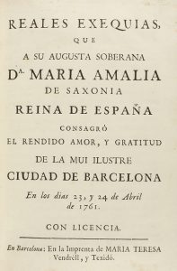 1761. LIBRO: (BARCELONA-EXEQUIAS REALES). REALES EXEQUIAS QUE A SU AUGUSTA SOBERANA Dª MARIA AMALIA DE SAXONIA REINA DE ESPAÑA CONSAGRÓ EL RENDIDO AMOR, Y GRATITUD DE LA MUI ILUSTRE CIUDAD DE BARCELONA en los dias 23, y 24 de...