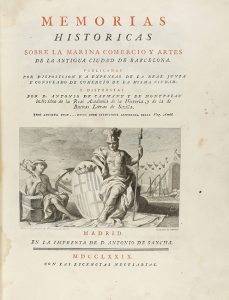 1779-1792. LIBRO: (BARCELONA-MARINA). CAPMANY Y DE MONTPALAU, ANTONIO: MEMORIAS HISTORICAS SOBRE LA MARINA COMERCIO Y ARTES DE LA ANTIGUA CIUDAD DE BARCELONA. Barcelona: Imp. Antonio de Sancha, 1779-1792. 4 vol. en 4º. I:...