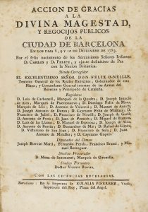 1783. LIBRO: (BARCELONA-HISTORIA). ACCION DE GRACIAS A LA DIVINA MAGESTAD, Y REGOCIJOS PUBLICOS DE LA CIUDAD DE BARCELONA EN LOS DIAS 8, 9 Y 10 DE DICIEMBRE DE 1783. POR EL FELIZ NACIMIENTO DE LOS SERENISIMOS SEÑORES INFANTES D....