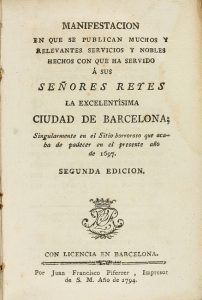 1794. LIBRO: (BARCELONA-HISTORIA). MANIFESTACION EN QUE SE PUBLICAN MUCHOS Y RELEVANTES SERVICIOS Y NOBLES HECHOS CON QUE HA SERVIDO A SUS SEÑORES REYES LA EXCELENTISIMA CIUDAD DE BARCELONA; SINGULARMENTE EN EL SITIO HORROROSO QUE...