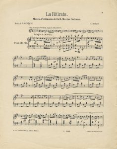 Manoscritto autografo dell’autore. Partitura. Con dedica: “Marcia festosa per Banda del M° Serventi con intrecci della Marcia Reale Inno Pontificio e Giovinezza scritto appositamente […] ai grandi artefici della Conciliazione fra Stato e Chiesa [1929]. SI AGGIUNGE: La marcia del Littorio. Milano: Carisch, 1930. Spartito per pianoforte e canto. Versi e musica di Ugo Saetti. SI AGGIUNGE: Fiamma italica. Inno degli ex combattenti. Torino: Fratelli Amprimo, s.a. Spartito per pianoforte e canto Di Angelo Romagna. Si allega altro spartito in piccolo formato. Con dedica autografa in entrambe gli spartiti. Una mancanza della carta senza perdita di testo. SI AGGIUNGE: I canti della nostra guerra. Roma: Ruccione, 1941. Spartito per pianoforte e canto. Contiene: La sagra di Giarabub, La canzone dei sommergibili, Camicia nera, Aquile, Vincere!, La camerata Richard, La canzone alpina, L’inno dell’Asse. SI AGGIUNGE: La ritirata. Marcia d’ordinanza della R. Marina Italiana. Milano: Carisch, s.a. Spartito per pianoforte. Musica di Tommaso Mario. -