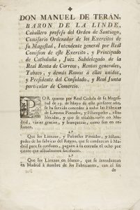 1779. FOLLETO: (BARCELONA-COMERCIO TELAS). [EDICTO REFERENTE AL COMERCIO DE TELAS]. DON MANUEL DE TERAN BARON DE LA LINDE... POR QUANTO POR REAL CEDULA DE SU MAGESTAD... HA SERVIDO CONCEDER A TODAS LAS FABRICAS DE LIENZOS...