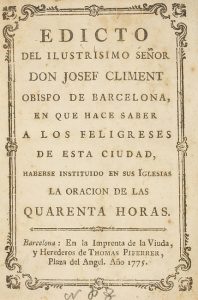 1775. FOLLETO: (BARCELONA). EDICTO DEL ILUSTRISIMO SEÑOR DON JOSEF CLIMENT OBISPO DE BARCELONA, EN QUE HACE SABER A LOS FELIGRESES DE ESTA DIUDAD, HABERSE INSTITUIDO EN SUS IGLESIAS LA ORACION DE LAS QUARENTA HORAS. Barcelona:...