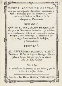 1775. LIBRO: (BARCELONA-ORDEN DE LA MERCED). FIRMAT, DOMINGO: DEBIDA ACCION DE GRACIAS, CON QUE CORRESPONDE BARCELONA AGRADECIDA A MARIA SANTISIMA POR SUS MERCEDES, AFIANZANDO EN LA SEÑORA DE LAS GRACIAS DE SU AMPARO, Y...