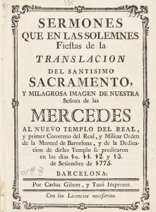 ORDEN DE LA MERCED DE BARCELONA, SE CELEBRARON EN ELLA EN LOS DIAS 10, 11, 12 , 13 y 14 DE SETIEMBRE DE 1775. Barcelona: por Carlos Gibert, 1775. 8º menor. XXVIII [Sigue: ]SERMONES QUE EN LAS SOLEMNES FIESTAS DE LA TRANSLACION DEL SANTISSIMO SACRAMENTO Y MILAGROSA IMAGEN DE NUESTRA SEÑORA DE LAS MERCEDES .... Idem. LXXVII. [Sigue:] LA TRANSLACION DEL ARCA DE LA ALIANZA DESDE SION A EL TEMPLO DE SALOMON. DRAMA SACRO QUE CON MOTIVO DE LA SOLEMNE TRANSLACION DEL Smo. SACRAMENTO, Y MILAGROSA IMAGEN DE NUESTRA SEÑORA DE LAS MERCEDES... Idem. XXIX. Todas las páginas orladas. Fresco papel. Falsas cubiertas de papel con el contenido manuscrito en el plano anterior.