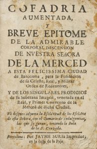 Librero, 1781. 8º mayor. 43 p. Con un grabado de la virgen en orla tipográfica. Sin cubiertas.[ Más:] ID.: ORACION GRATULATORIA QUE EN LA ACCION DE GRACIAS... CELEBRO LA ORDEN MILITAR DE S. JUAN DE JERUSALEN... Barcelona: Herederos de Bartholome y Maria Angela Giralt, 1783. 1 h. + 31 p. Sin cubiertas. [Más:] COFRADIA AUMENTADA, Y BREVE EPITOME DE LA ADMIRABLE CORPORAL DESCENSION DE NUESTRA SEÑORA DE LA MERCED A ESTA FELICISSIMA CIUDAD DE BARCELONA... Barcelona: Imp. Jayme Suria, 1739. 8º menor. 30 p. Algún punto de óxido. Sin cubiertas.