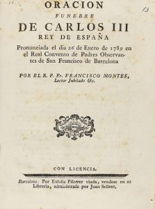 1789. FOLLETO: (BARCELONA-ORACION FUNEBRE). MONTES, FRANCISCO: ORACION FUNEBRE DE CARLOS III REY DE ESPAÑA. Pronunciada el dia 26 de Enero de 1789 en el Real Convento de Padres Observantes de San Francisco de Barcelona....
