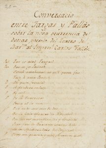1790 ca. MANUSCRITO: (BARCELONA). CONVERSACIO ENTRE FARGAS Y PALLAS SOBRE LA NOVA OCURRENCIA DE DONAR POSESIO DEL TEATRO DE BAR.NA AL IMPRS.I CARLOS VALLES. [Sigue:] DISCURSOS SERIOS DE UN MORIBUNDO ROMNAS. 8 h....