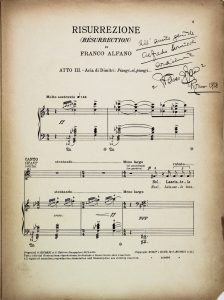 Manoscritto a inchiostro blu su carta intestata dell’autore. Busta conservata, consegnata a mano. Dimensioni: 140x220 mm. SI AGGIUNGE: Id., Risurrezione. Aria di Dimitri - Piangi, si, piangi… Milano: Ricordi, 1927 [da timbro a secco]. Spartito per canto e pianoforte. Con dedica autografa di Alfano ad Alfredo Sernicoli. I DOCUMENTO: «Carissimo ho il piacere di presentarti una giovanissima e bella figliuola, che ha una piacevole voce – ma intonata e gradevole, natura musicale – insomma atta a realizzare – secondo me – il presente tuo ideale: cantare canzoni. Certo, studiando ancora potrà aspirare a migliori successi […]. Te la raccomando caldamente – sicuro e della tua bontà come della tua perizia […]». Sernicoli (1895-1966) fu un celebre tenore. Collaborò da sempre con l’EIAR e divenne primo regista e produttore esecutivo della televisione italiana. Successivamente divenne direttore della RAI.
