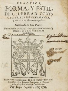 1701. LIBRO: (DERECHO CATALÁN). PRACTICA, FORMA, Y ESTIL, DE CELEBRAR CORTS GENERALS EN CATHALUNYA, Y MATERIAS INCIDENTS EN AQUELLAS. Barcelona: Imp. Rafel Figuerò, 1701. 8º mayor. 8 h. + 104 p. + 22 h. Portada con grabado...