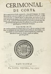 1701. LIBRO: (BARCELONA-GUERRA DE SUCESIÓN). CERIMONIAL DE CORTS. OBRA COMPILADA DE LLOCHS AUTENTUCHS, LLEYS DEL PRINCIPAT DE CATHALUNYA... REIMPRIMIT PER DELIBERACIÓ DELS TRES BRAÇOS DE LAS CORTS... Barcelona: Rafel Figueró,...