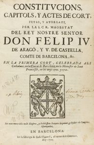1702. LIBRO: (DERECHO CATALÁN). CONSTITUCIONS, CAPITOLS, Y ACTES DE CORT, FETAS, Y ATORGATS, PER LA S, C, R, MAGESTAT DEL REY NOSTRE SENYOR DON FELIP IV DE ARAGÓ, Y V. DE CASTELLA, COMTE DE BARCELONA en la primera cort, celebrada...
