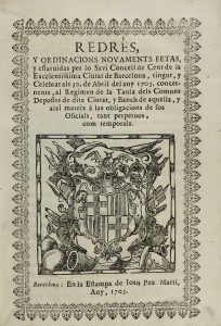 del Comuns Deposits de dita Ciutat, y Banch de aquella, y aixi maeix à las obligacions de sos Oficials, tant perpetuos, com temporals. Barcelona: Estampa de Ioan Pau Marti, 1703. 8º mayor. Portada grabada al boj. 92 p., 6 hojas. Pérdidas de papel y texto en las esquinas de las páginas 3, 5, 11, 13, 19, 21, 27, 29, 35, 37, 43, 45, 51, 53, 59, 61, 67, 69, 75, 77, 83, 85, y tres hojas de la tabla. Enc. pergamino de época. Palau 253109. *B07-46.