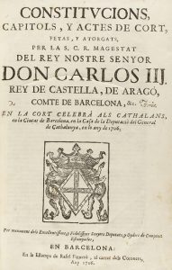 1706. LIBRO: (DERECHO CATALÁN). CONSTITUCIONS, CAPITOLS, Y ACTES DE CORT, FETAS, Y ATORGATS, PER LA S.C.R. MAGESTAT DEL REY NOSTRE SENYOR DON CARLOS III REY DE CASTELLA, DE ARAGO, COMTE DE BARCELONA, & C. Rey de Castella, de Aragó,...